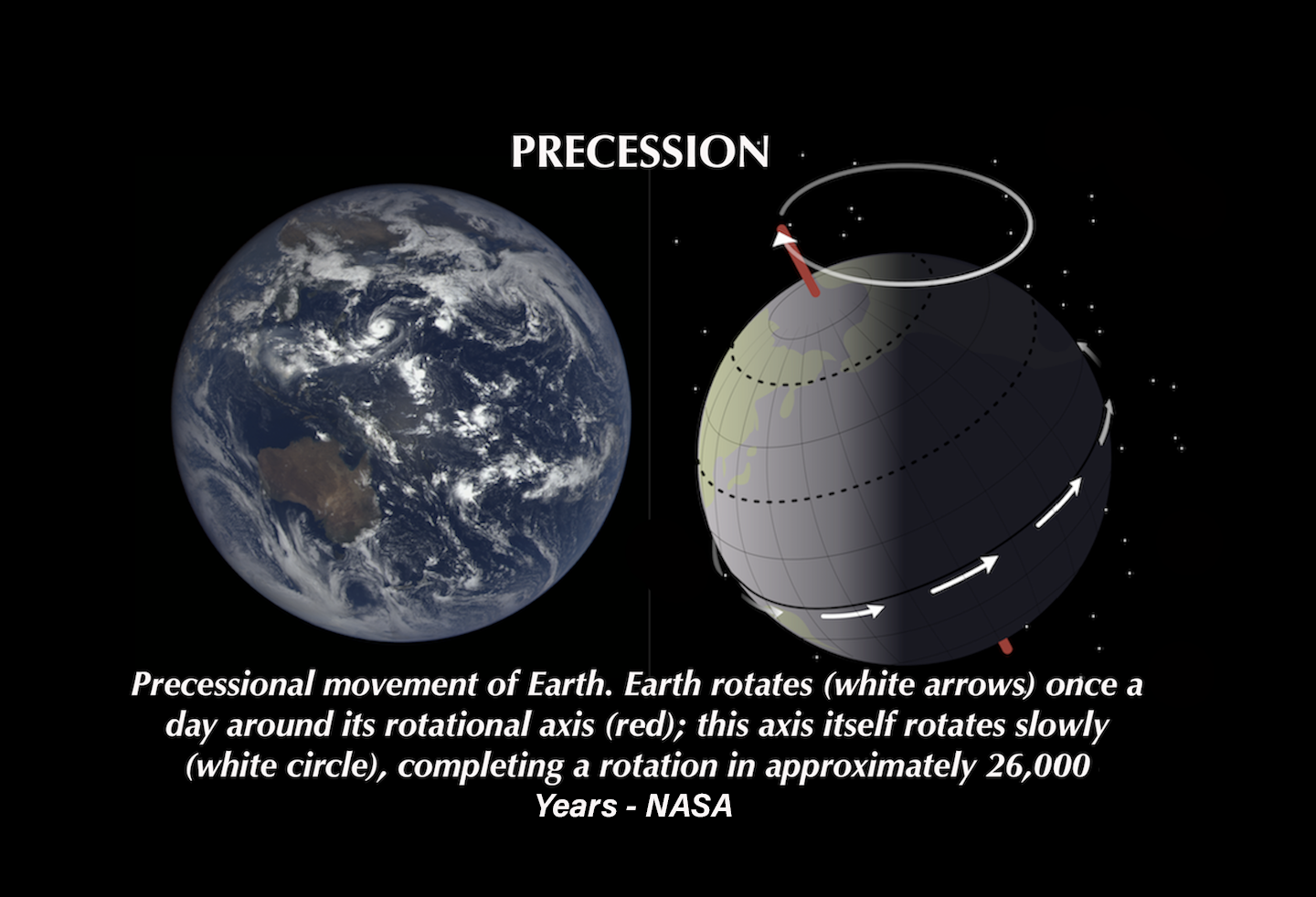 The image shows the precessional movement of the Earth. The white arrows show the earth’s 24 hour rotation around its own rotational axis, (red arrows). This axis ( white circle) is also rotating slowly to complete one full rotation in roughly 26,000 years.